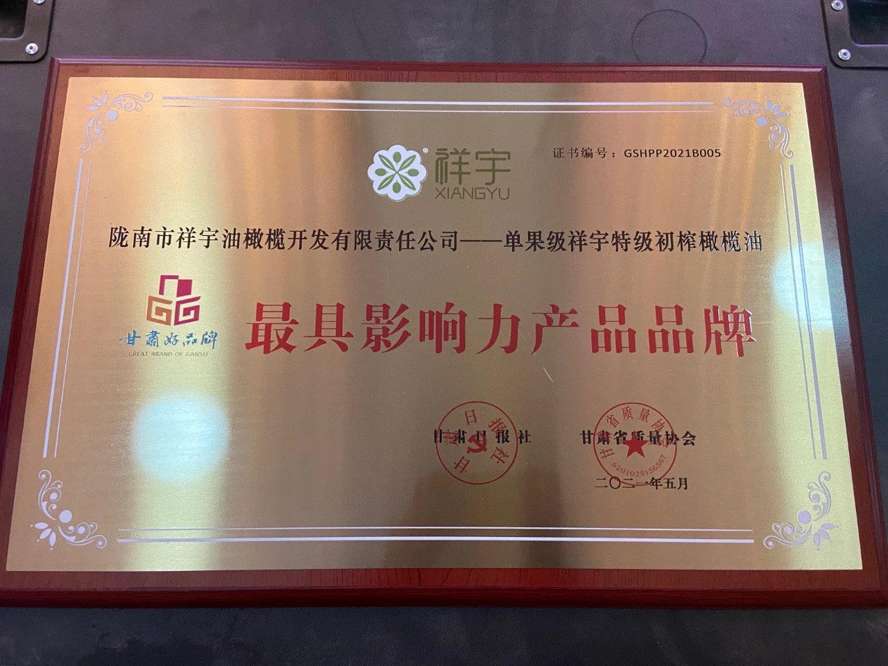 祥宇橄欖油榮獲2021“甘肅好品牌”最具影響力產品品牌!